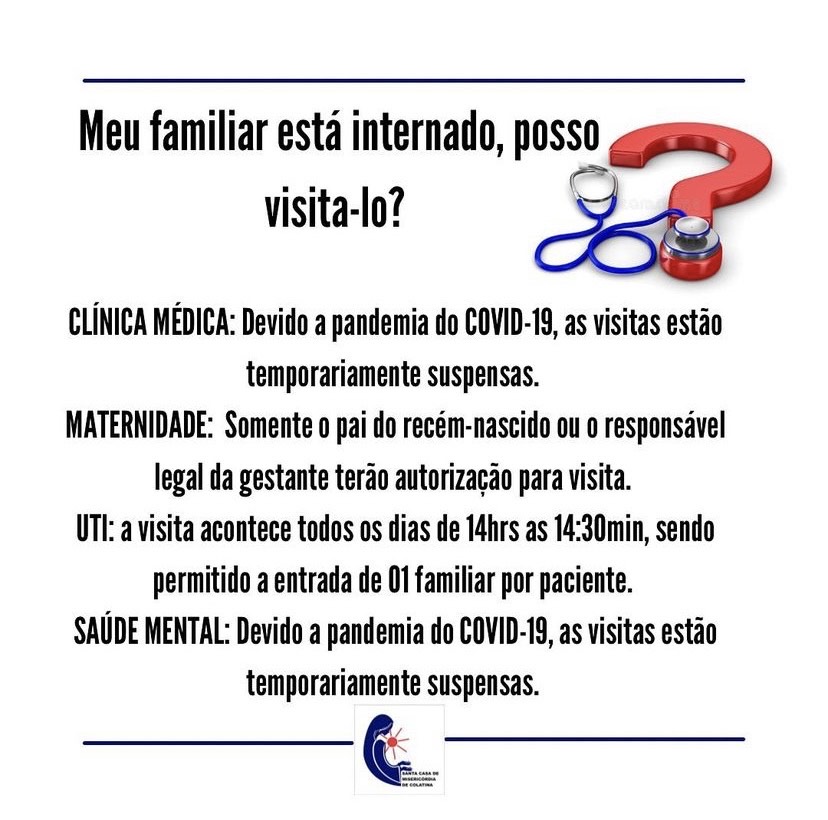 CLÍNICA MÉDICA: Devido à pandemia do COVID-19, as visitas estão temporariamente suspensas.